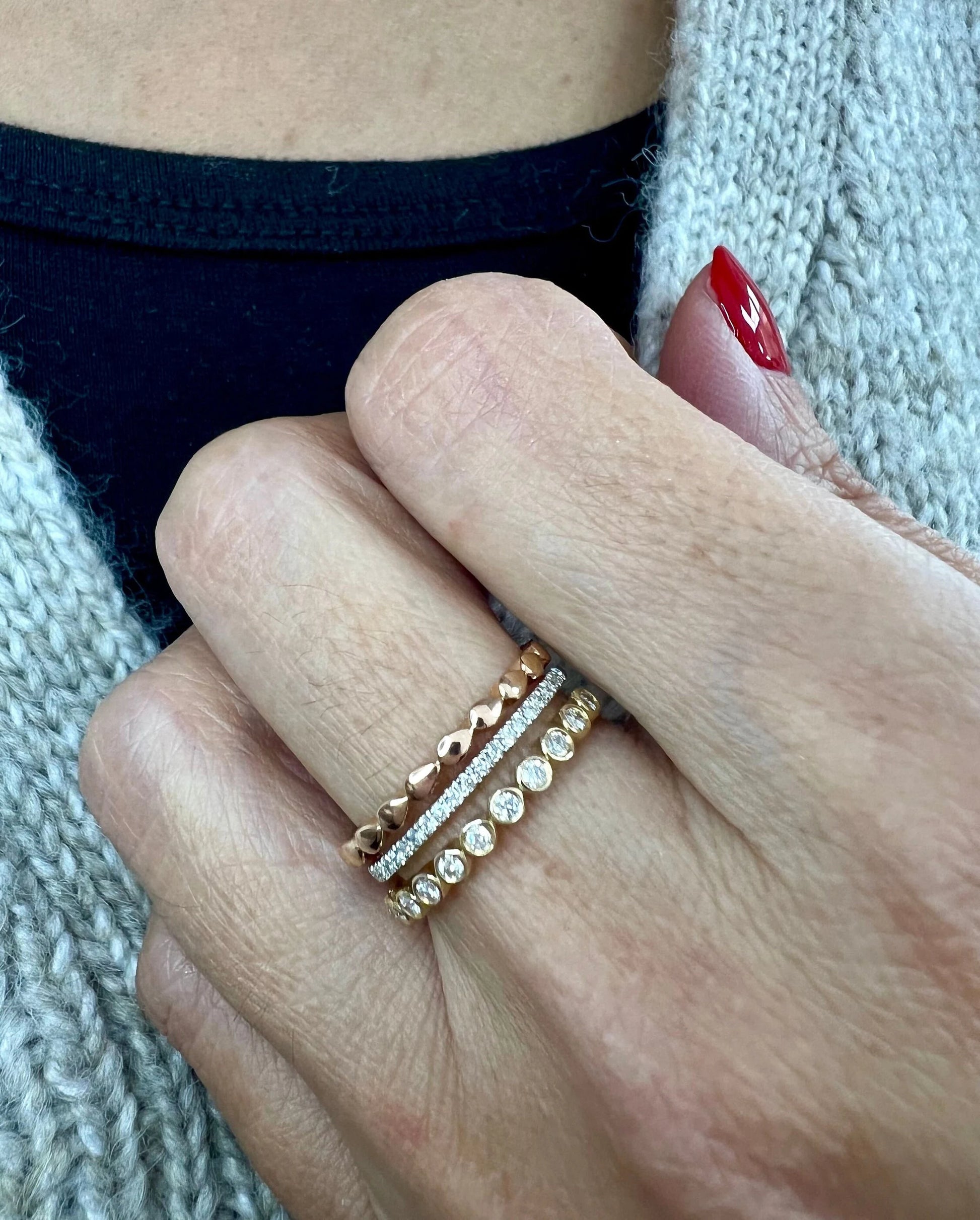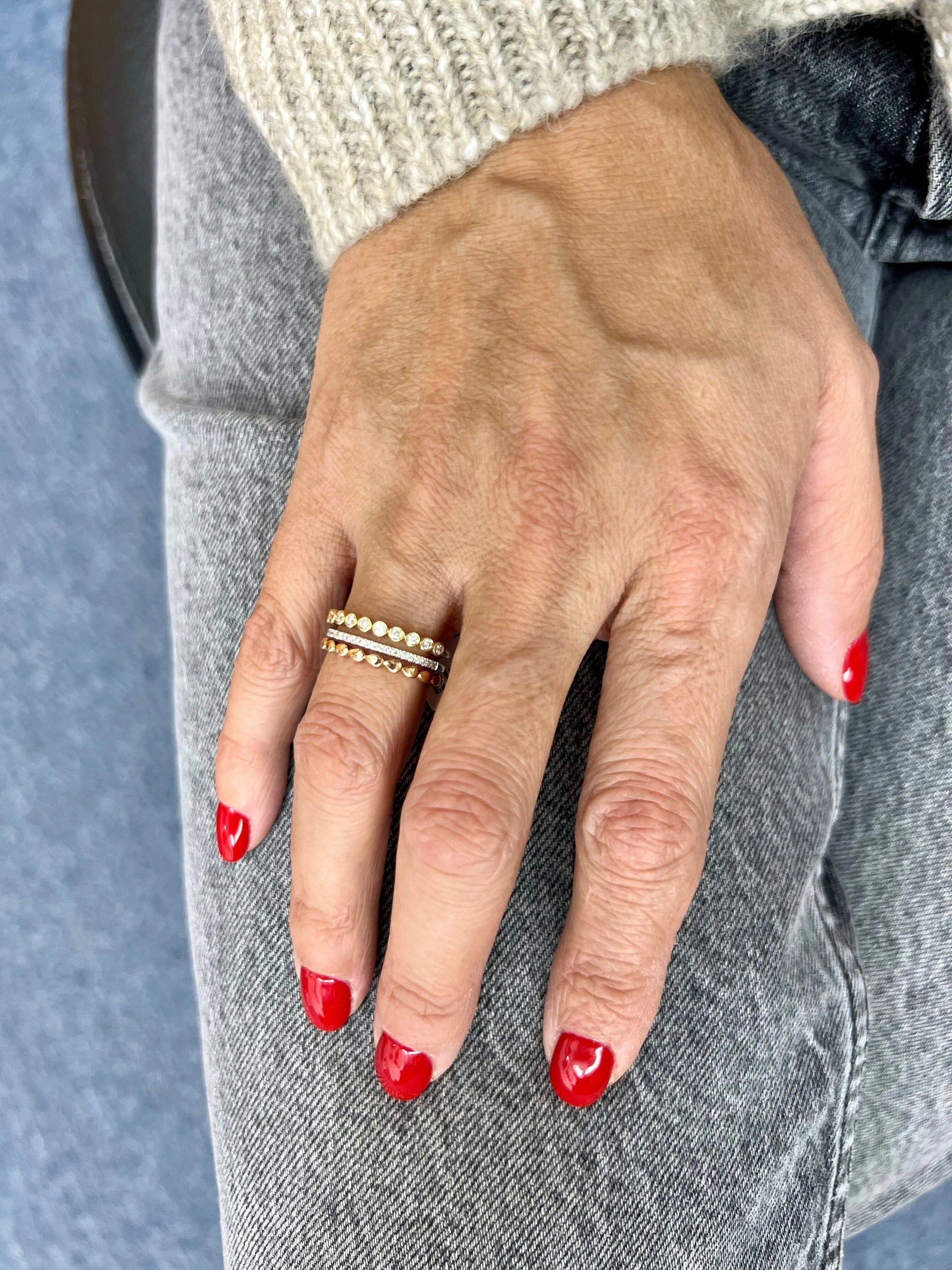 A three-band diamond ring exudes elegance and sophistication with its captivating design. Each band, adorned with glistening diamonds, intertwines harmoniously to create a stunning visual symphony. Symbolizing past, present, and future, this timeless piece represent enduring love and commitment. Whether worn as an engagement ring or a token of appreciation, its exquisite craftsmanship and sparkling diamonds make it a cherished treasure, reflecting the beauty of eternal bonds. Beautiful worn alone or together with other rings.