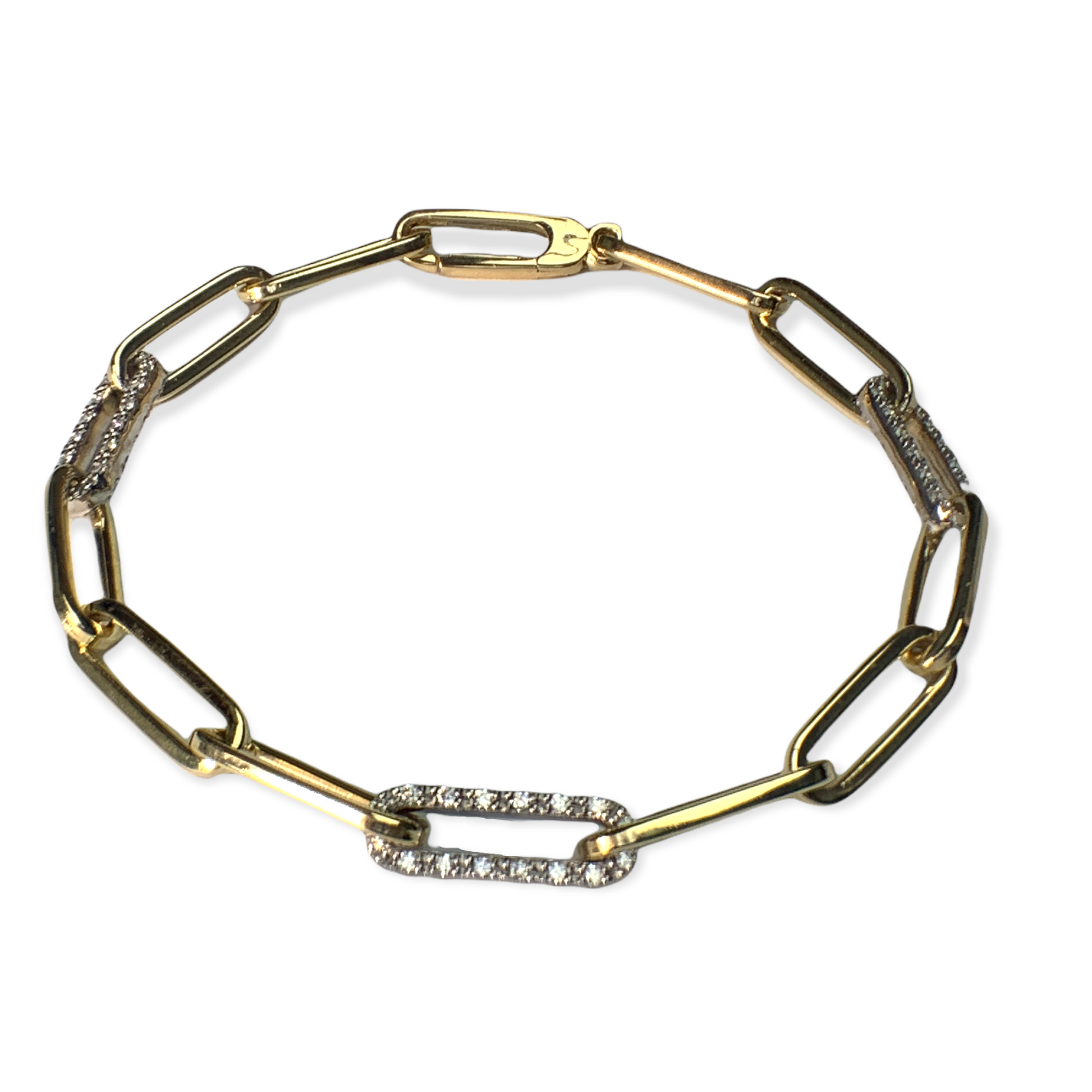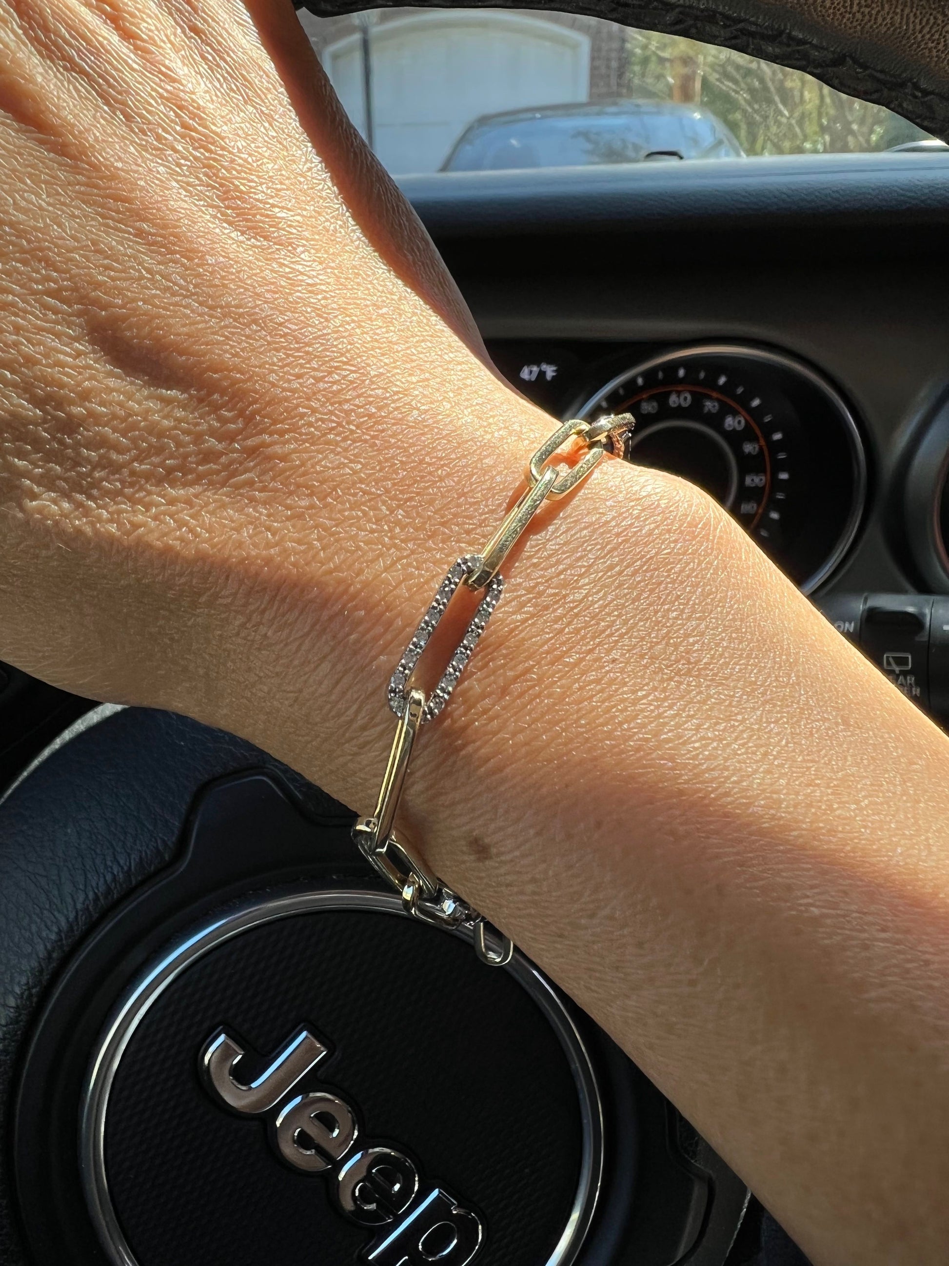 The natural two-tone gold & diamond paperclip bracelet is a tried and true design and one of my favorite bracelets to make a statement with. Pave diamonds in a sleek style that is bound to make an impression.