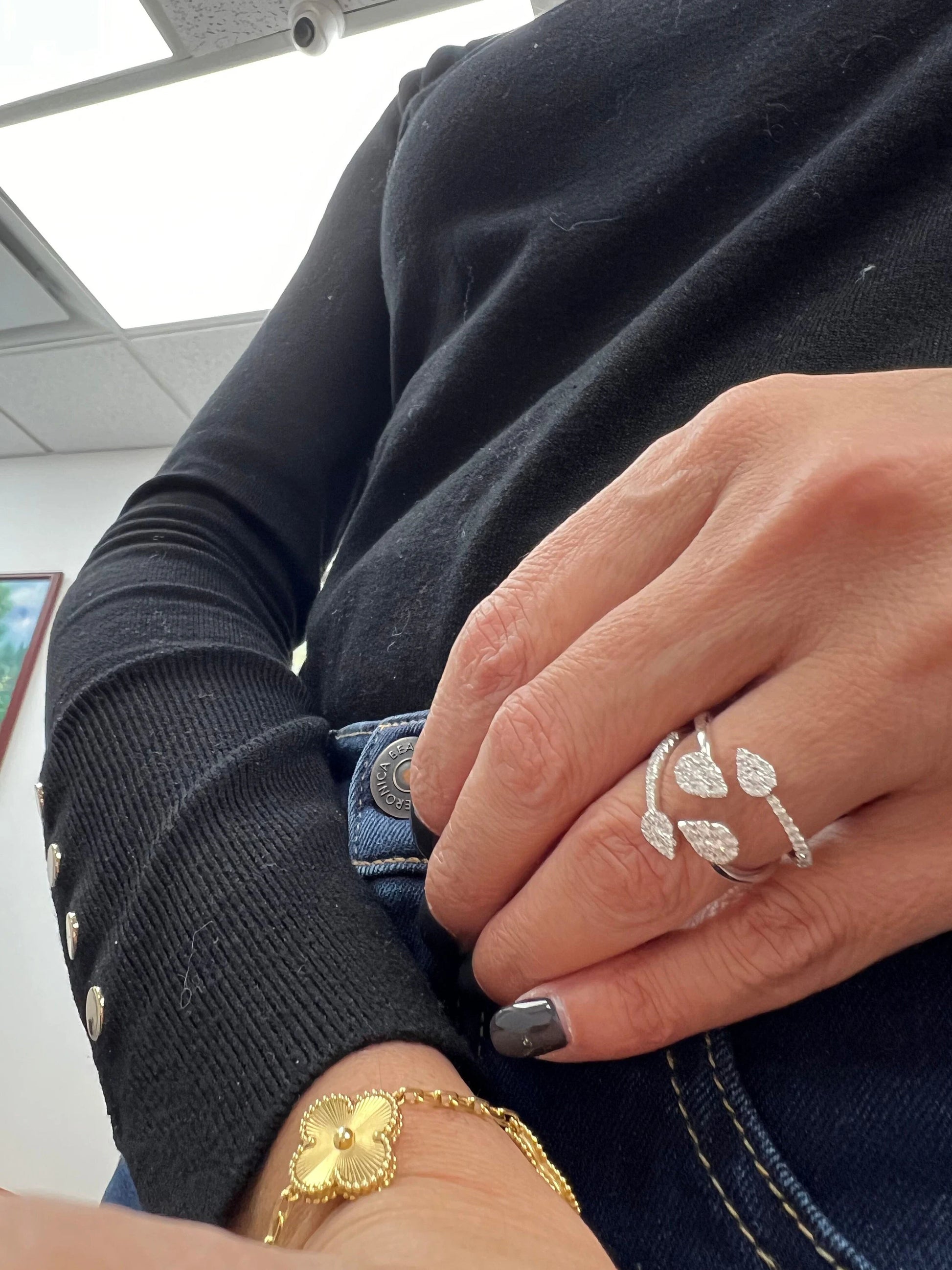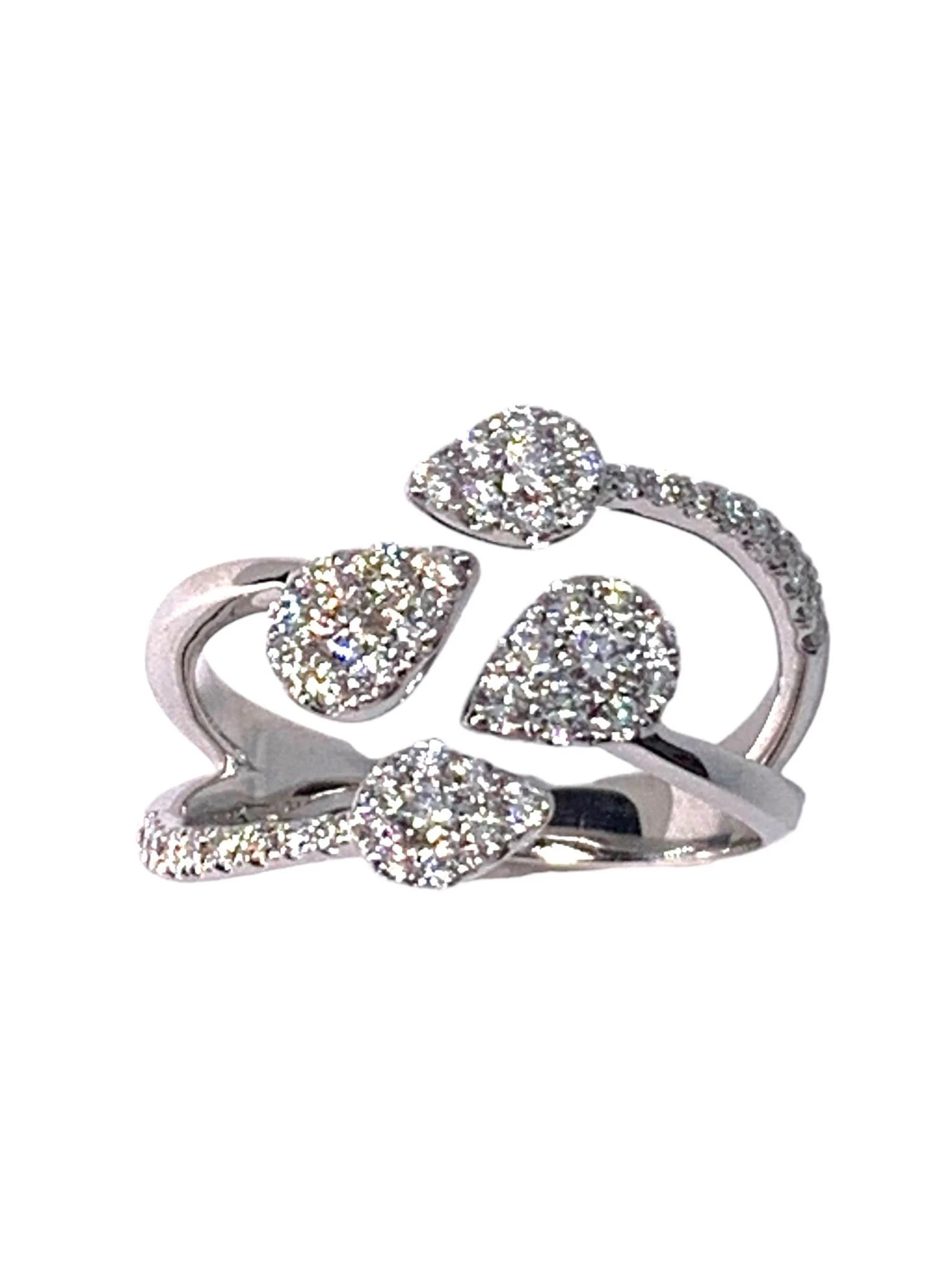 Indulge in the epitome of luxury with our exquisite 14K gold pear-shaped diamond ring, adorned with four resplendent pear-shaped diamonds, each cradling a constellation of small diamonds within. Crafted to captivate, this ring exudes elegance and grace, offering a breathtaking symphony of brilliance and sparkle with every movement. Elevate any occasion with this enchanting piece, a symbol of timeless beauty and refined taste. Beautiful worn alone or together with other rings.