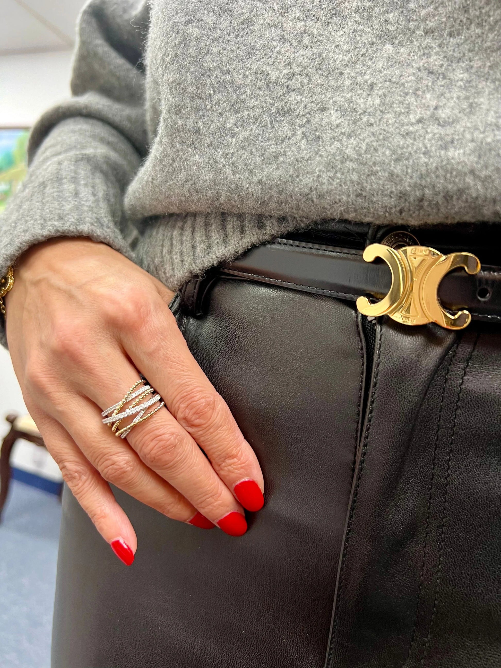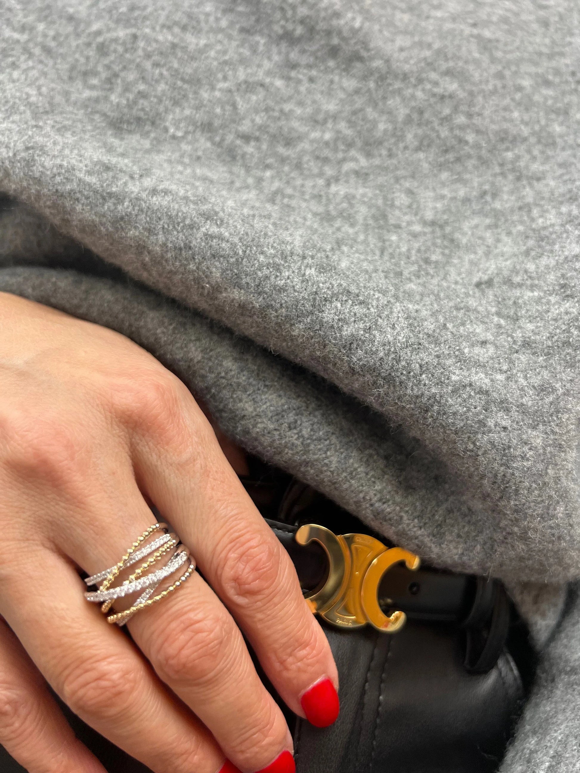 Elevate your ensemble with the exquisite allure of this 14K gold ring, meticulously crafted to captivate with its sophisticated design. Featuring three rows of radiant diamonds intertwined with three rows of lustrous beads, this two-tone masterpiece exudes modern elegance and timeless charm. The harmonious blend of textures and tones creates a captivating contrast, making it versatile statement piece for any occasion. Whether worn as a symbol of luxury or to add a touch of glamour to everyday wear, this 14K gold ring is sure to turn heads and level a lasting impression. Beautiful worn alone or together with other rings.