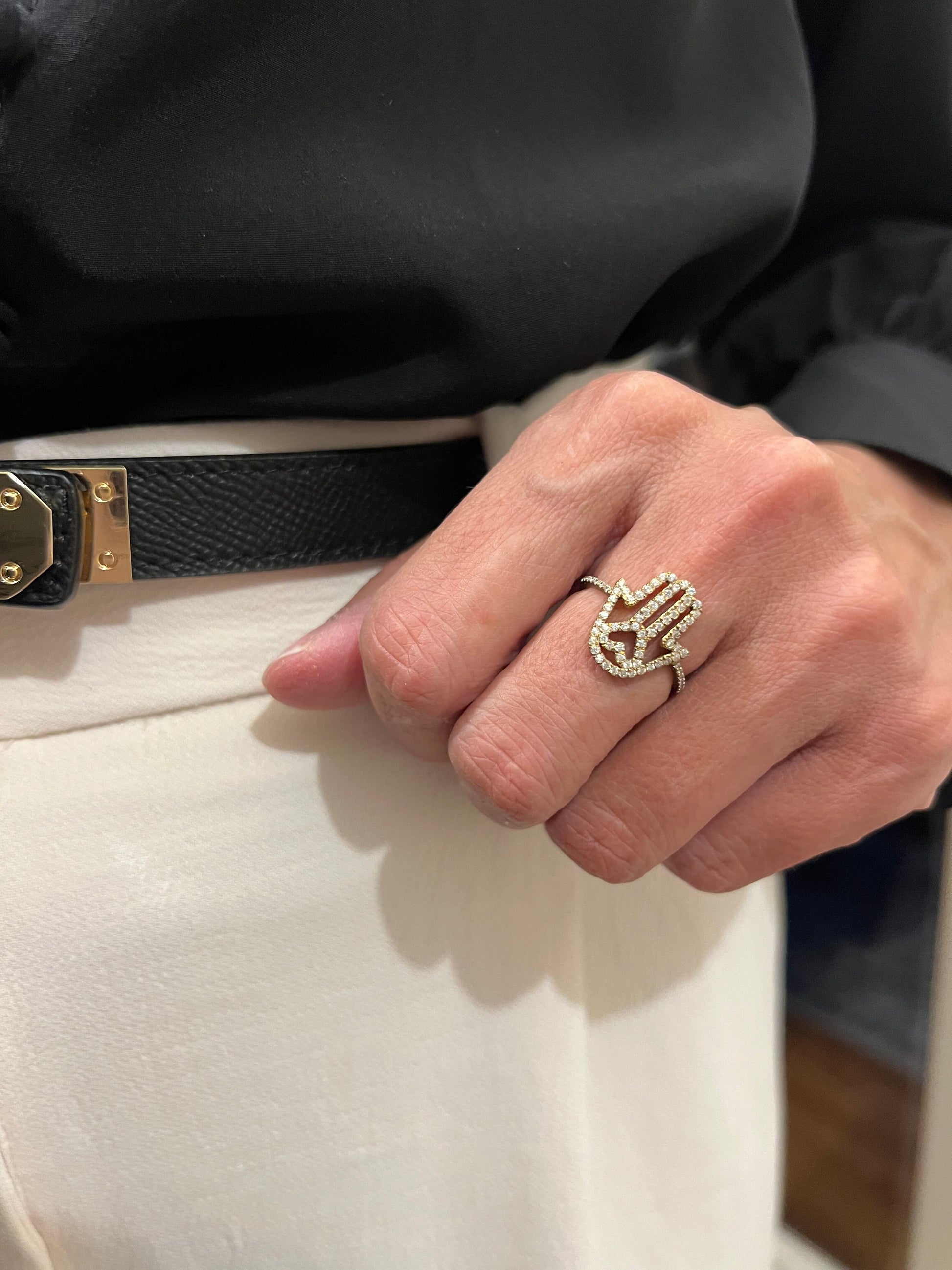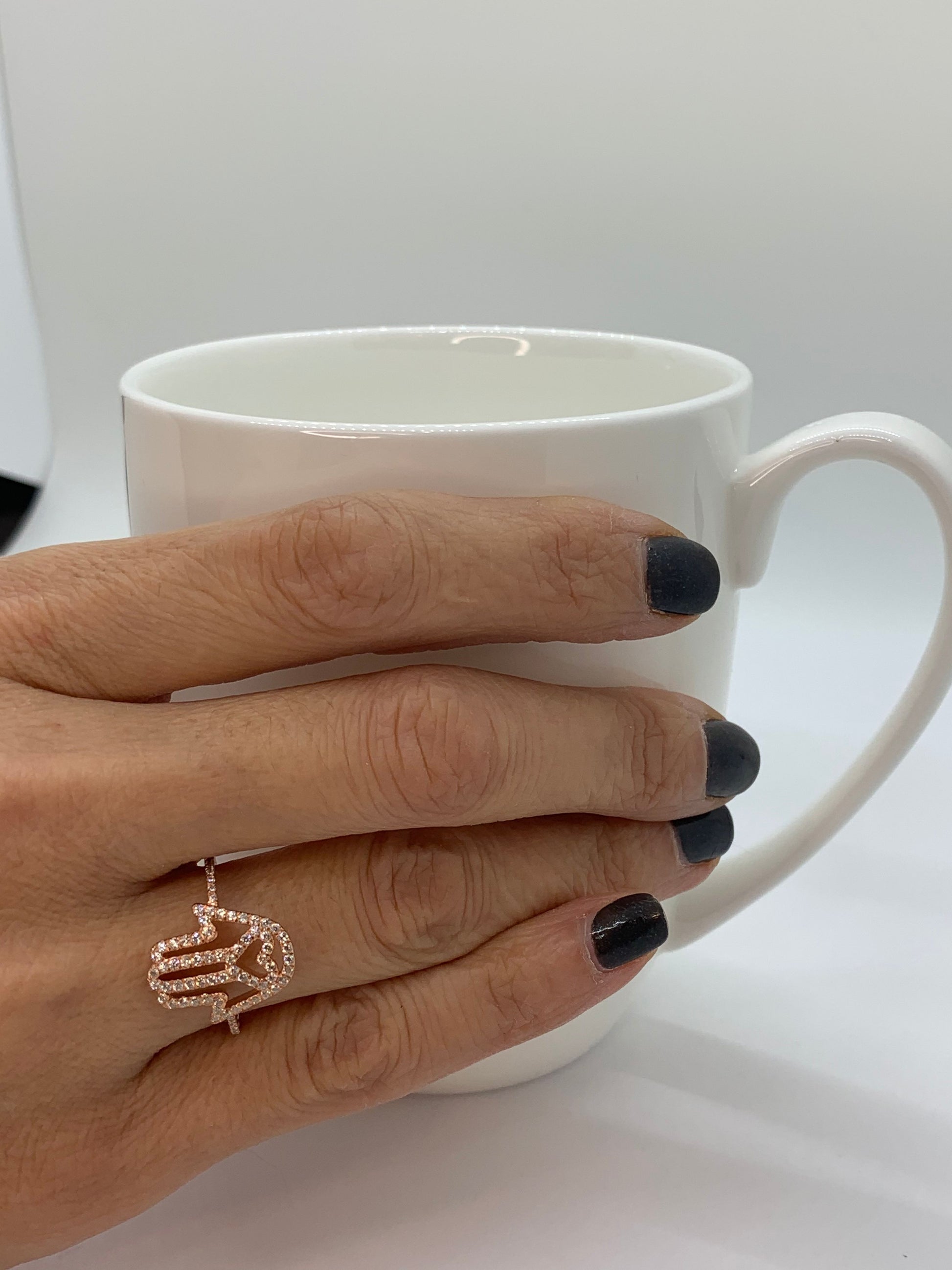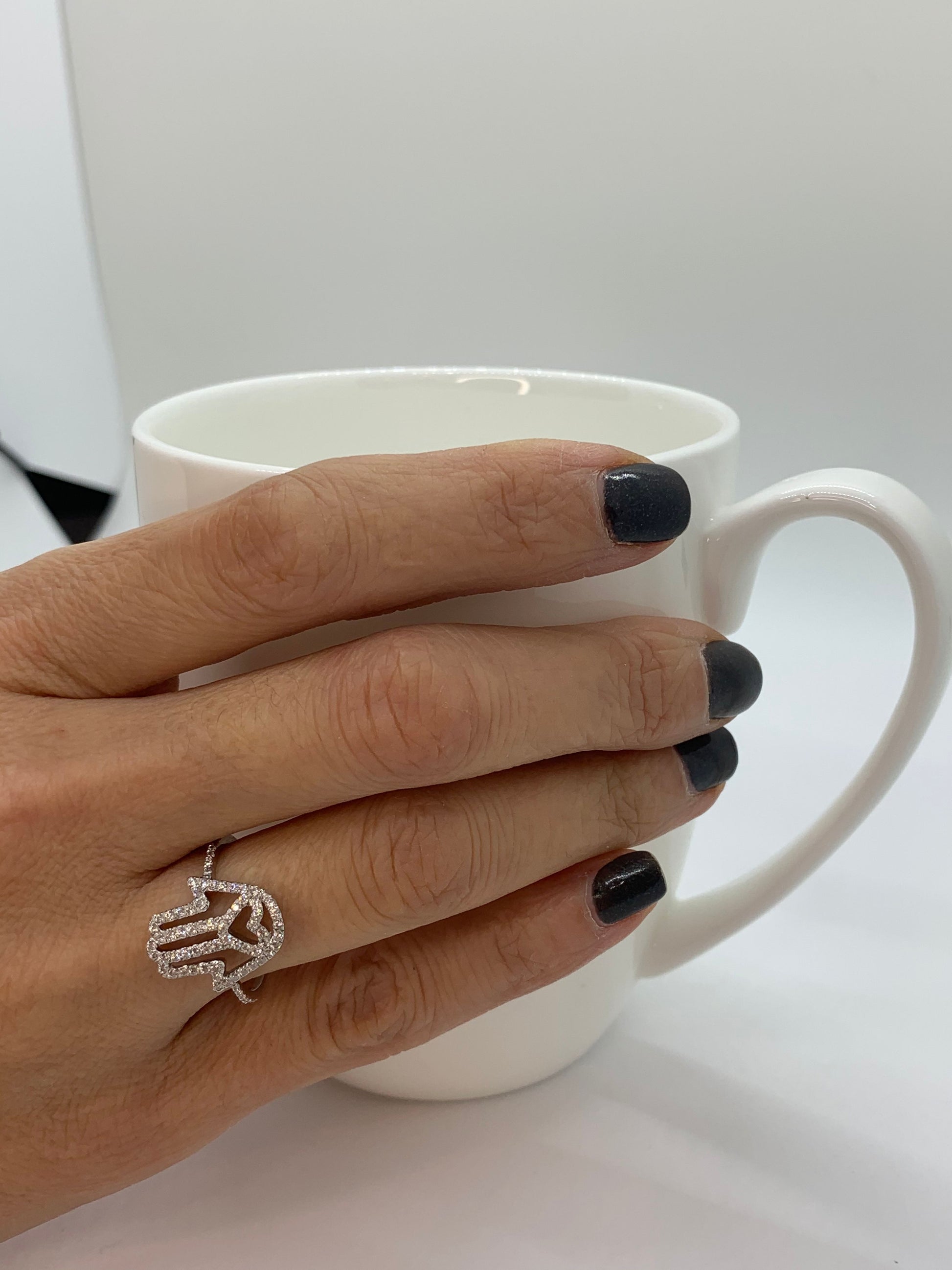 This sterling silver ring features a bold, open design of a stylized Hamsa hand outlined with shimmering pav'e-set cubic zirconia stones, creating a modern and artistic statement piece. Wear the ring on your finger and you are bound to make an impression.